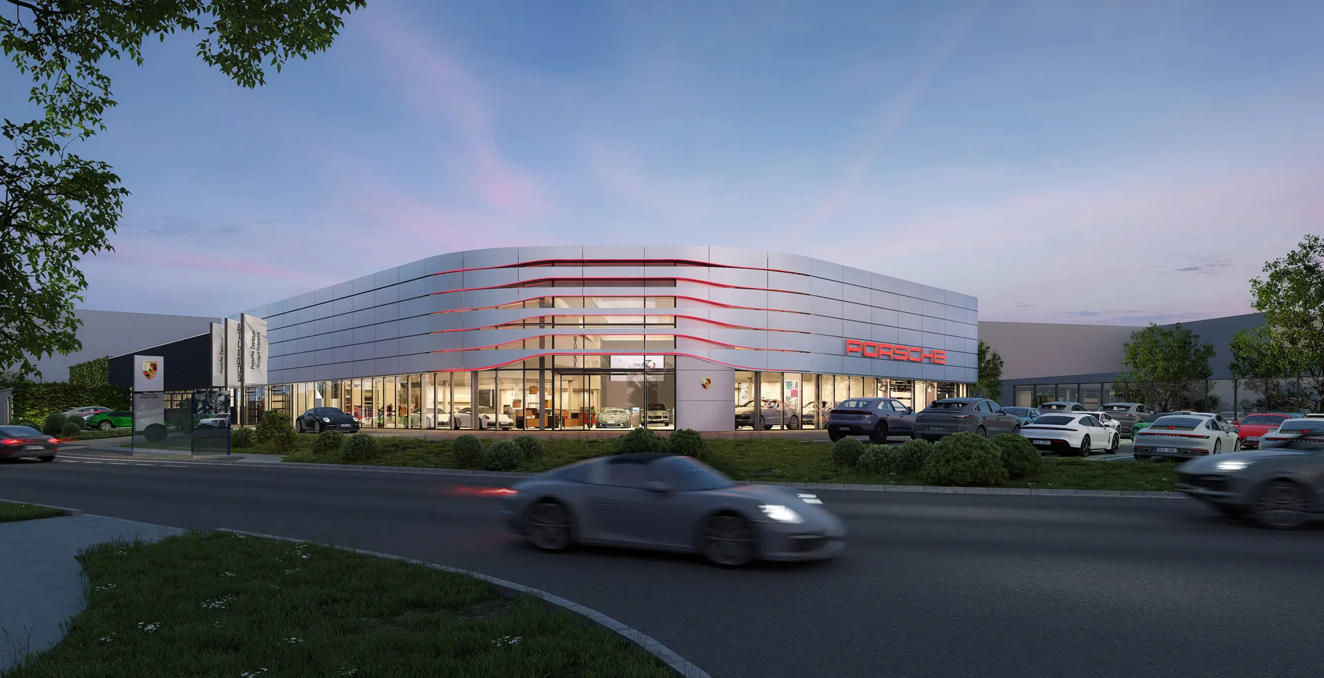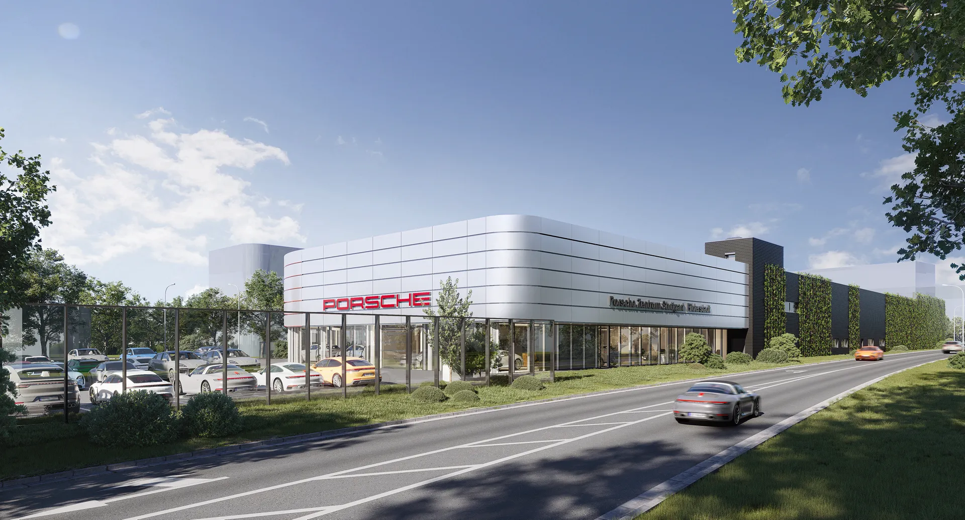 Der geplante Neubau des Porsche Zentrum am Standort Stuttgart-Filderstadt dient als Autohaus mit Vollfunktionsbetrieb mit Ausstellung, Werkstatt, Lagerflächen und Waschanlage.